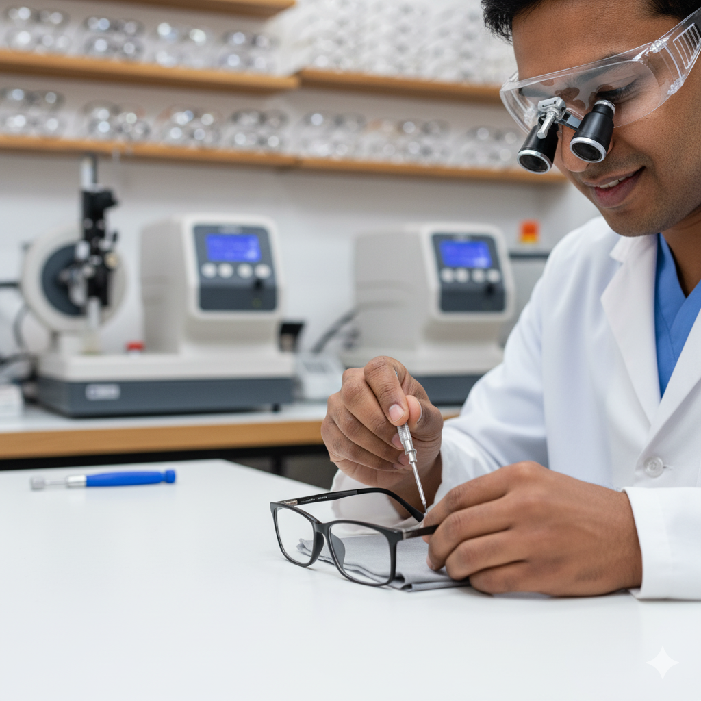 Fixes damage or malfunctions—like broken hinges, scratched lenses, or misaligned frames—to restore functionality.